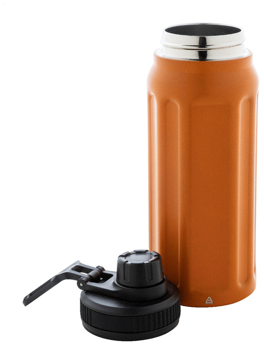 Dvoustěnná termoska z recyklované nerezové oceli s vertikálními drážkami. S víčkem z polypropylenu a s integrovaným držadlem. 540 ml.