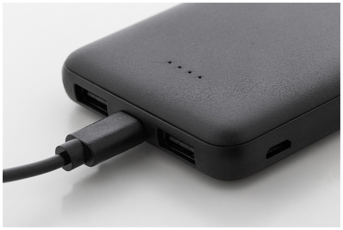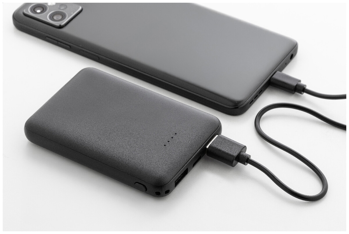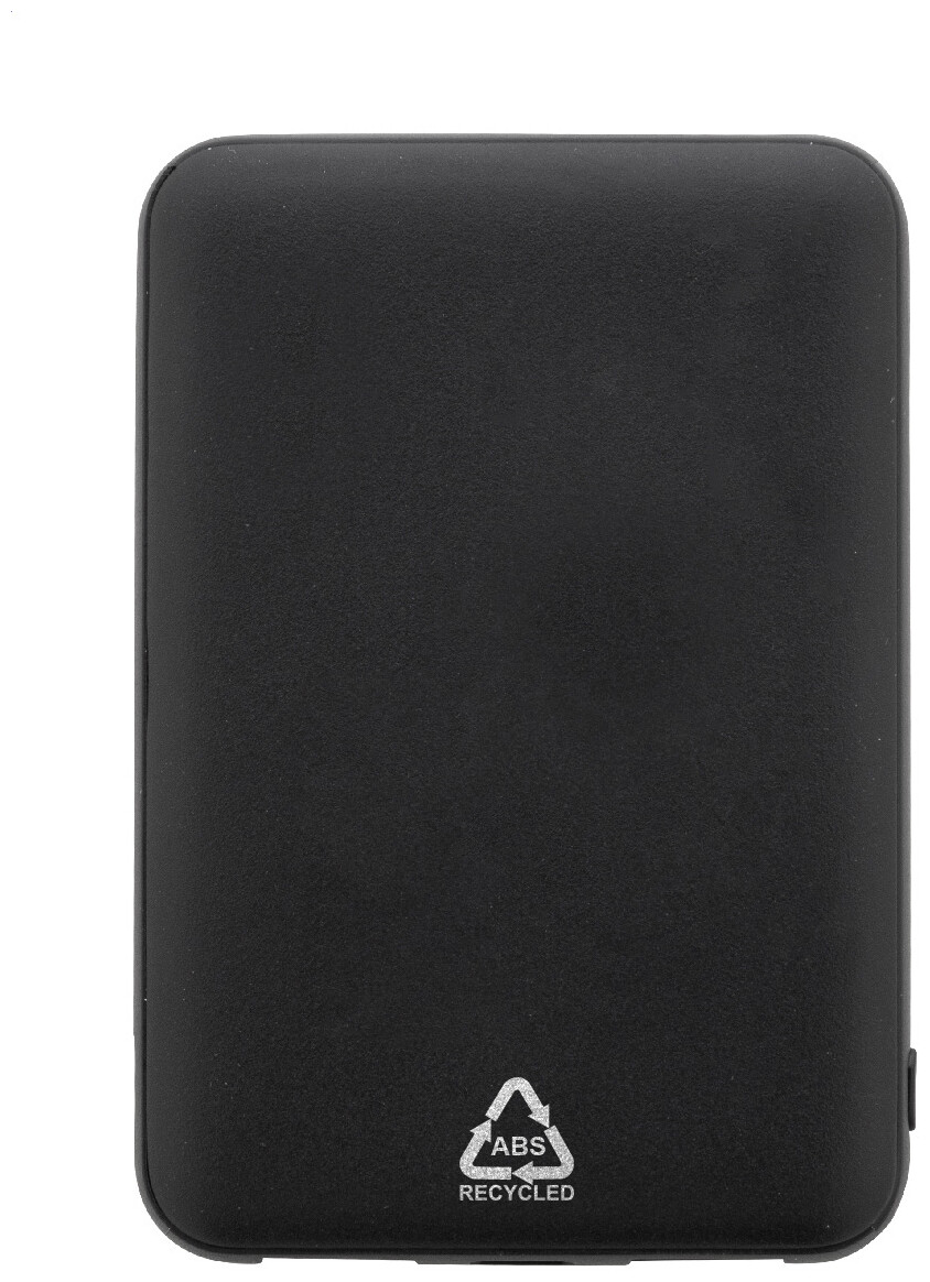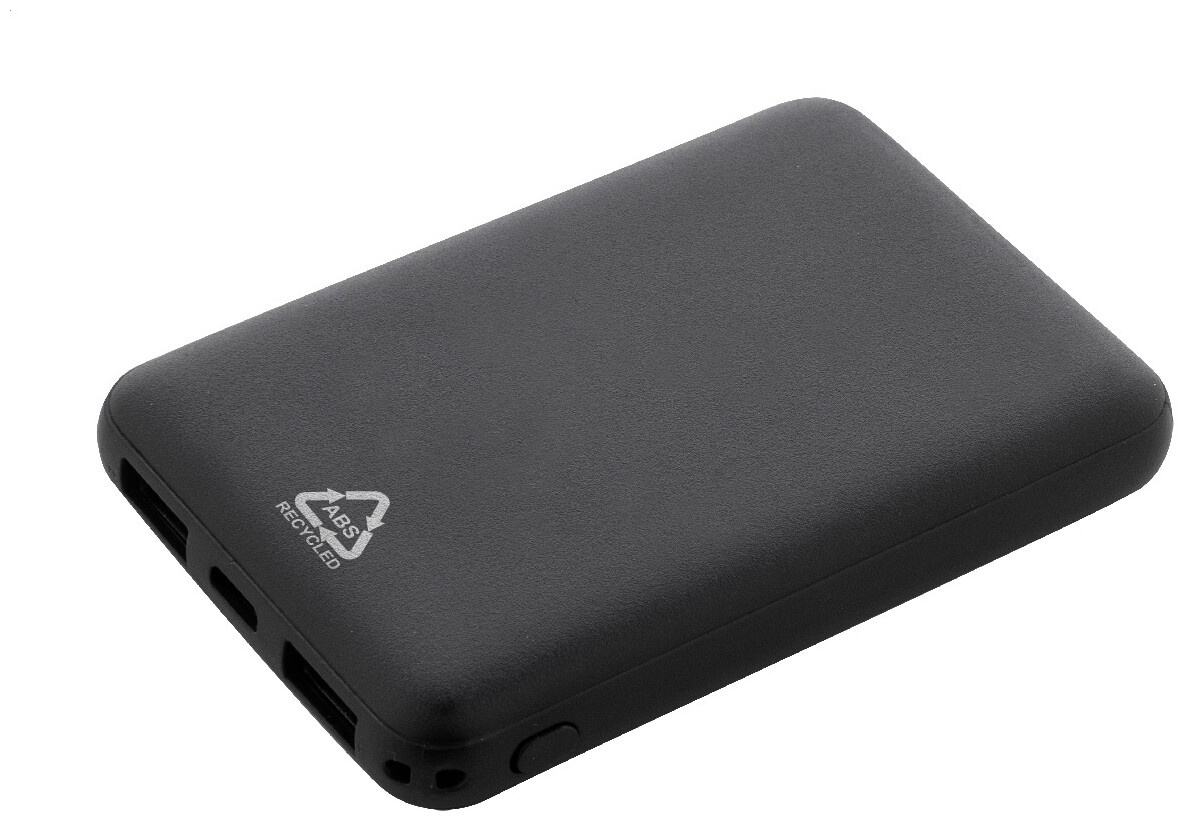 Power banka z recyklovaného ABS plastu s baterií 5 000 mAh. Se 2 USB a 1 nabíjecím portem USB-C. Vstupní porty micro USB a USB-C. Včetně nabíjecího kabelu USB.