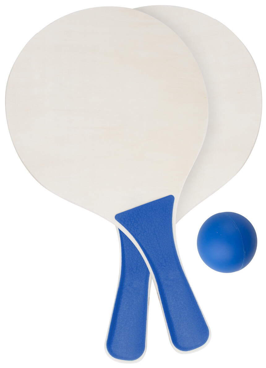 2 rakety a jeden míček, vyrobeno ze dřeva a plastu.
