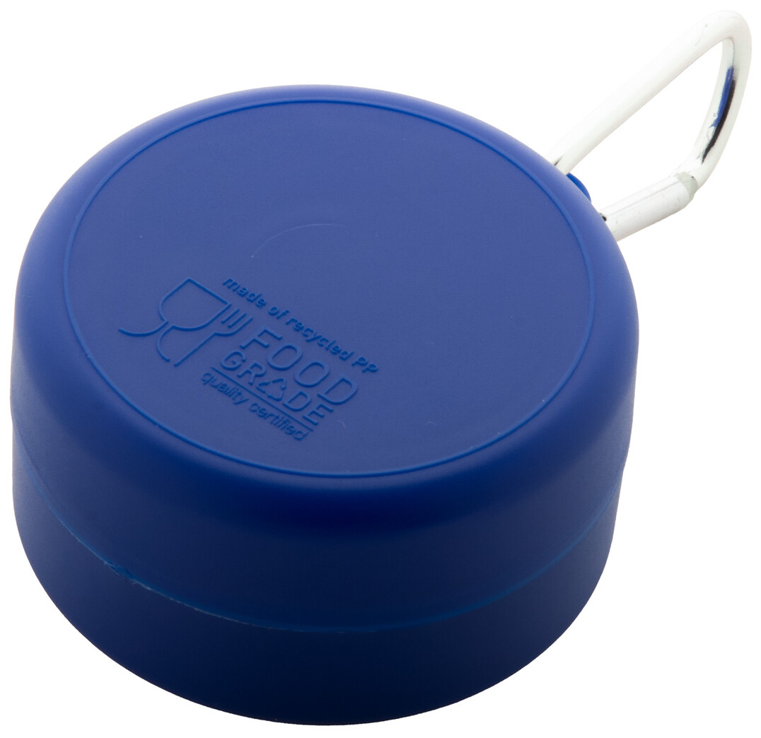 Skládací kelímek z recyklovaného PP plastu s přihrádkou na pilulky a kovovou karabinou. 220 ml. Bez BPA.