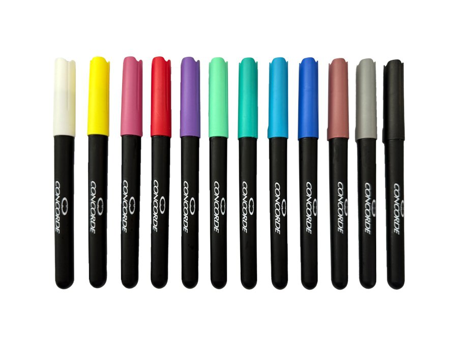 Akrylové popisovače CONCORDE Recolor – sada 12 ks popisovačů vhodných pro kreativní využití na světlých i tmavých površích, jako je plátno, papír, hladké dřevo, sklo, plast nebo kámen. Jsou baleny v praktickém transparentním kufříku s uchem pro snadné skladování a přenos.