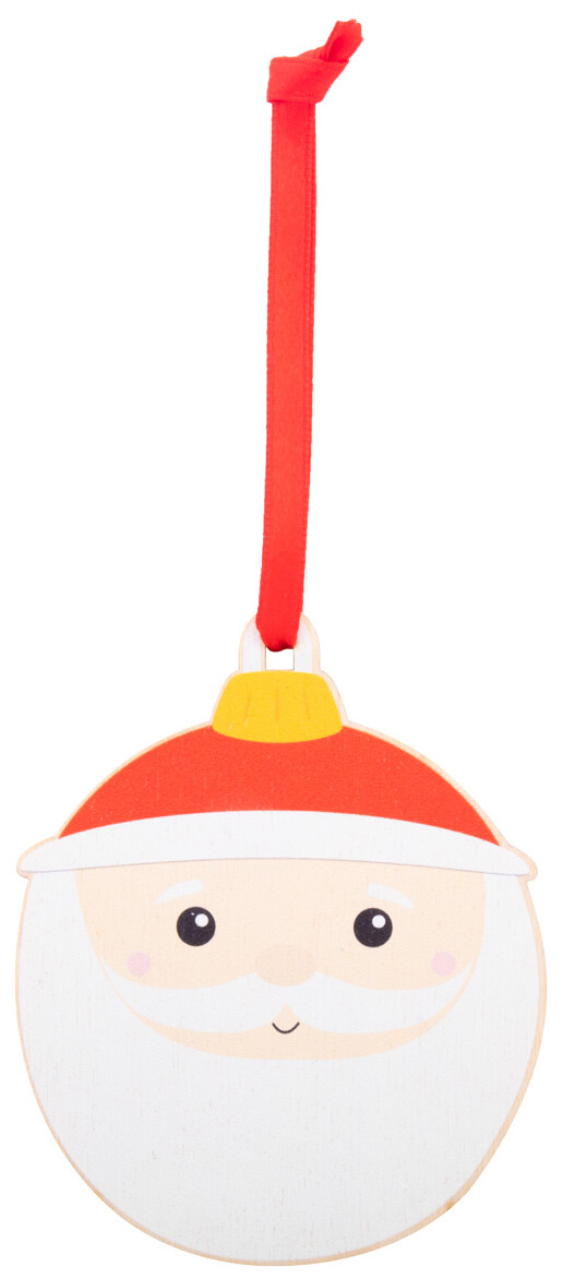 Vánoční ozdoba z březové překližky, s tištěným vánočním designem a červenou stužkou, která je dodávána zvlášť.