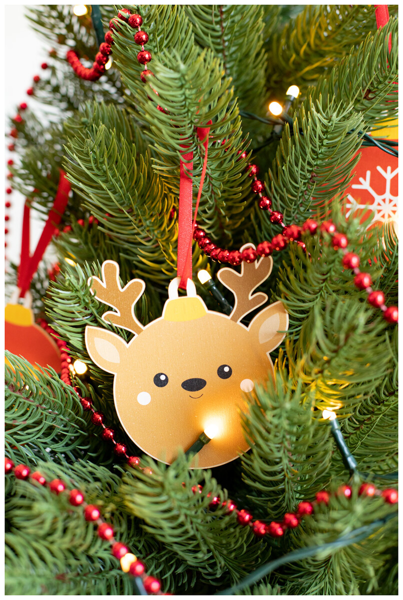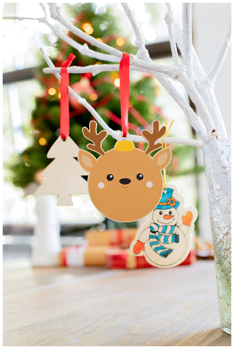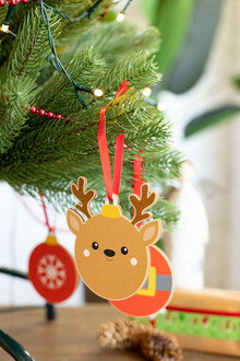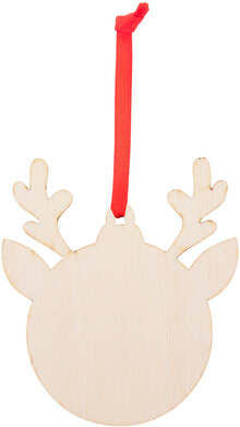 Vánoční ozdoba z březové překližky, s tištěným vánočním designem a červenou stužkou, která je dodávána zvlášť.