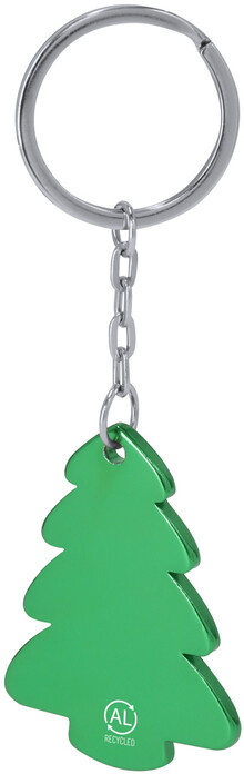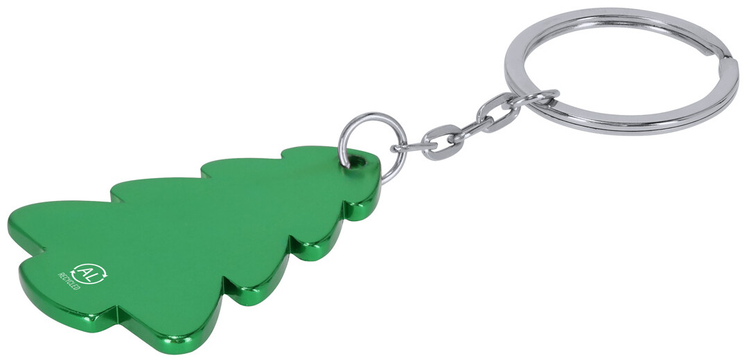 Přívěšek na klíče z recyklovaného hliníku ve tvaru vánočního stromku s kovovým kroužkem.