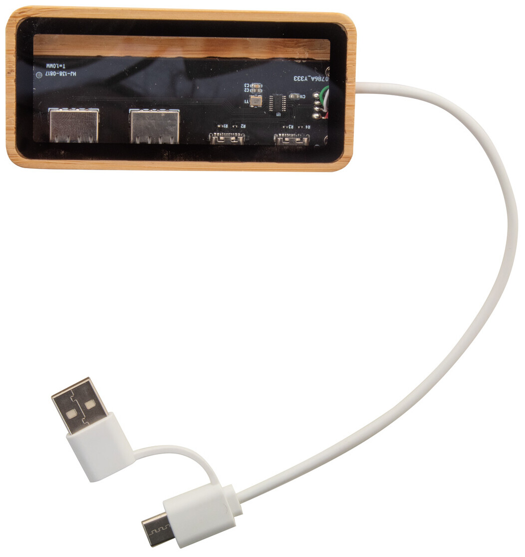 Poloprůhledný bambusový USB hub s viditelnými elektronickými součástkami, 2 USB a 2 USB-C porty, USB 2.0. Včetně kabelu s připojením USB a USB-C.