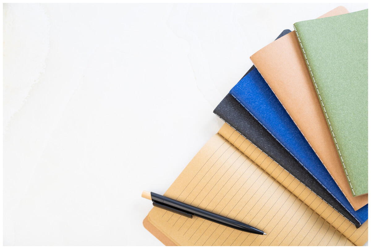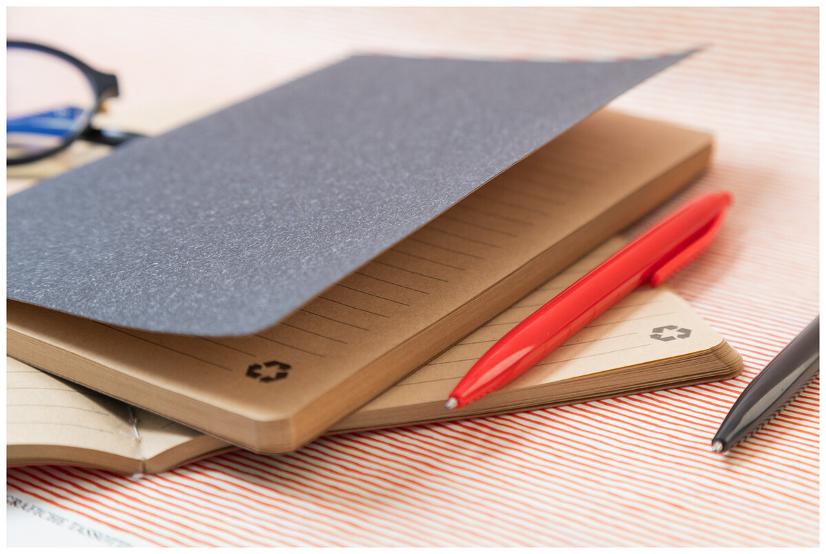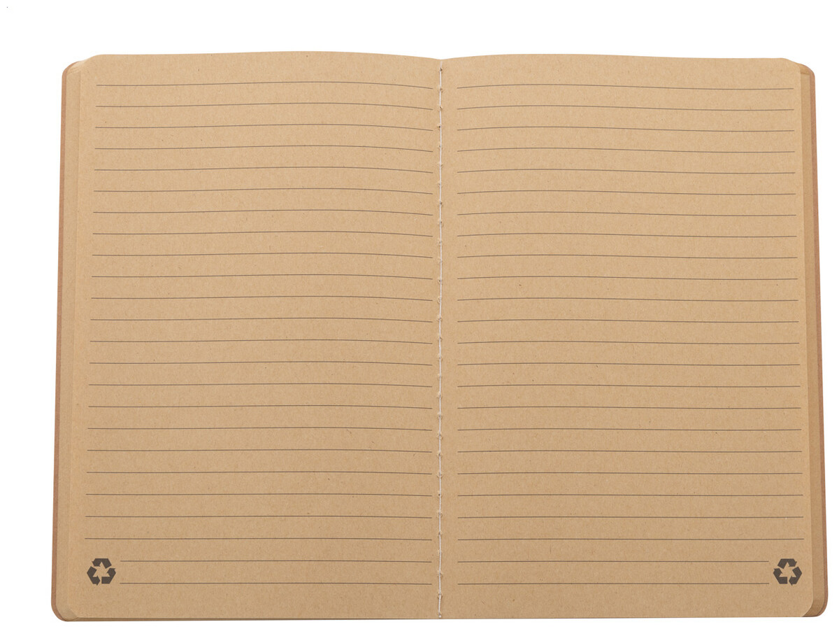 Blok A5 potažený recyklovaným papírem se šitými deskami a 60 linkovanými listy z recyklovaného kraftového papíru.