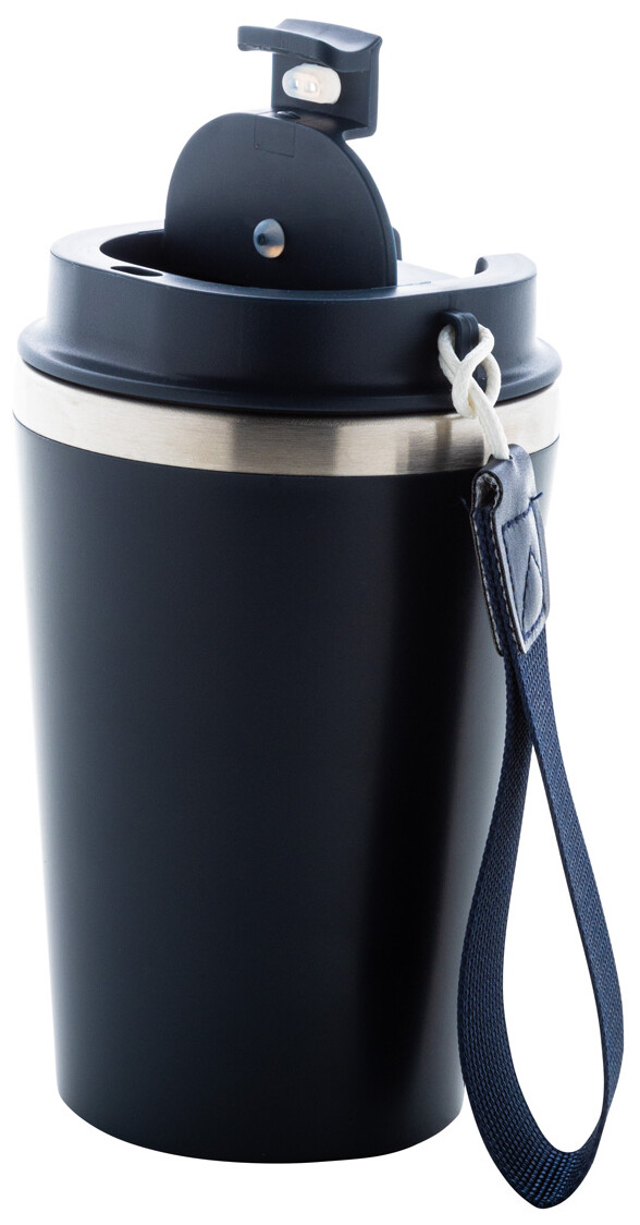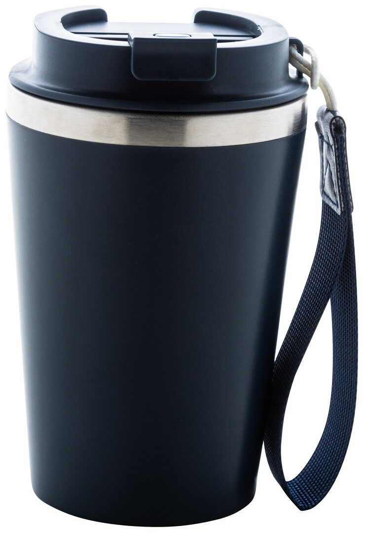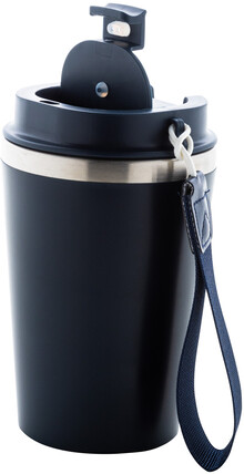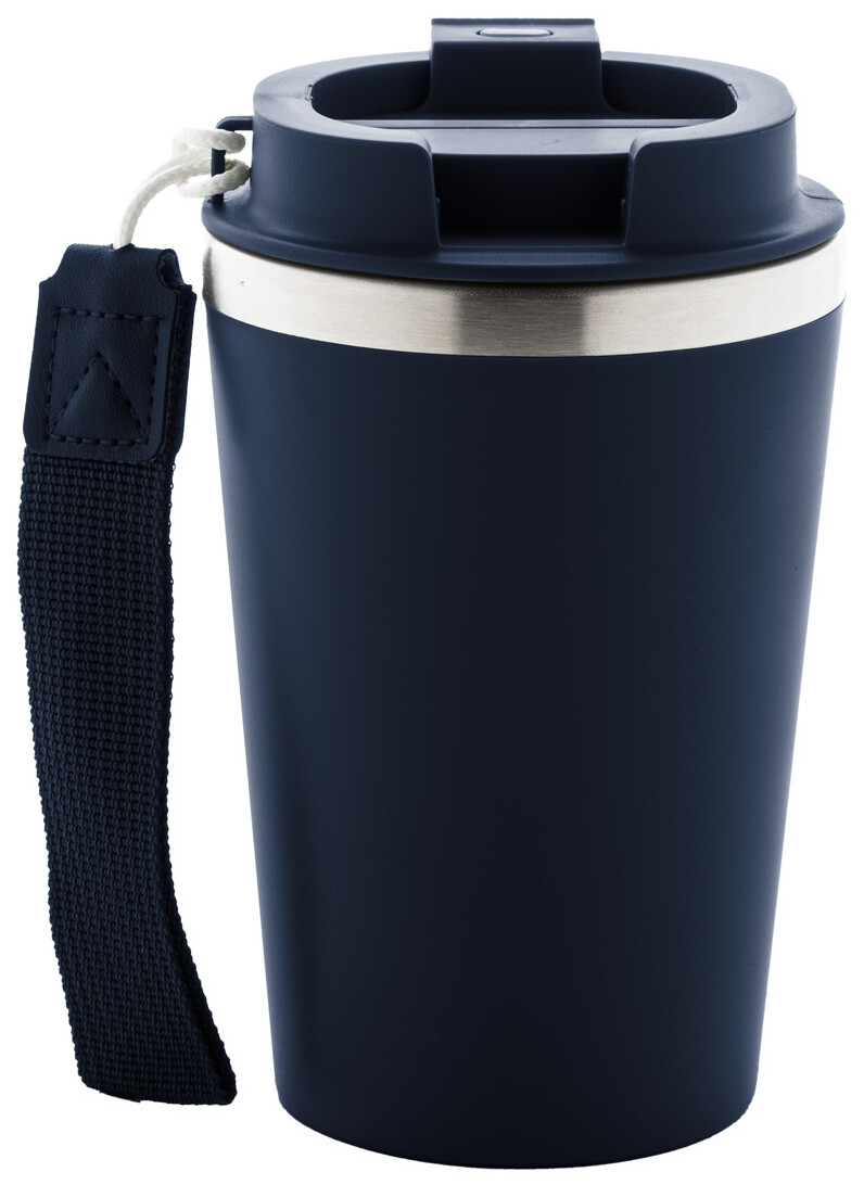 Dvoustěnný termo hrnek z recyklované nerezové oceli s vnějším PP plastem a víčkem na pití. S popruhem na přenášení RPET. 350 ml.