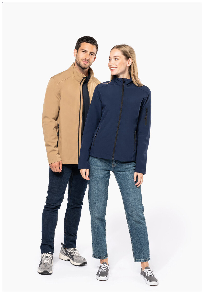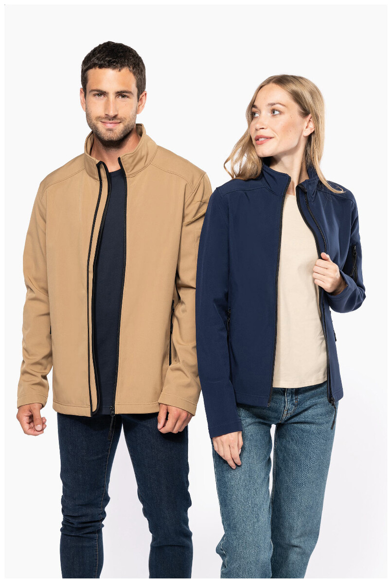 Třívrstvá, prodyšná, větru a vodě odolná softshellová bunda na zip s rukávy na zip a bočními kapsami. S prodyšnou střední vrstvou a vnitřní vrstvou z mikropolaru. Materiál: 95 % polyester a 5 % elastan, 300 g/m2. Výrobek značky Kariban.
