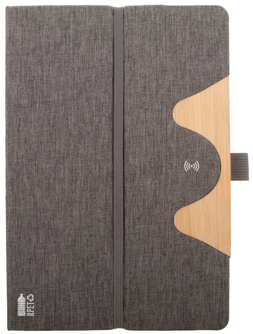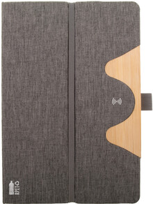 Blok A5 potažený polyesterem RPET s bambusovou vložkou, funkcí stojánku na mobil a vestavěnou bezdrátovou rychlonabíječkou (15W). S 80 linkovanými listy z recyklovaného papíru. Včetně USB nabíjecího kabelu.