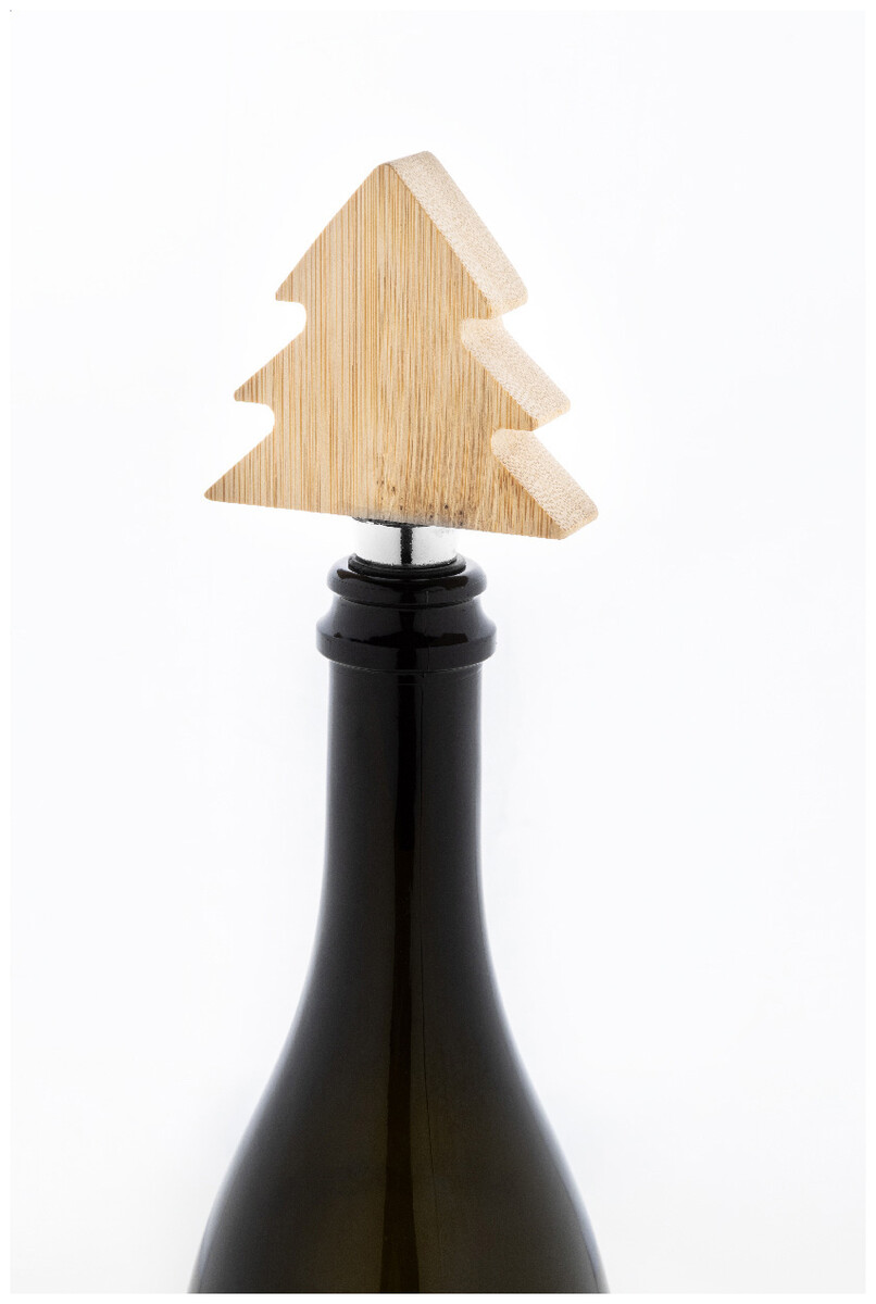 Kovová zátka na víno s bambusovou ozdobou ve tvaru vánočního stromečku.