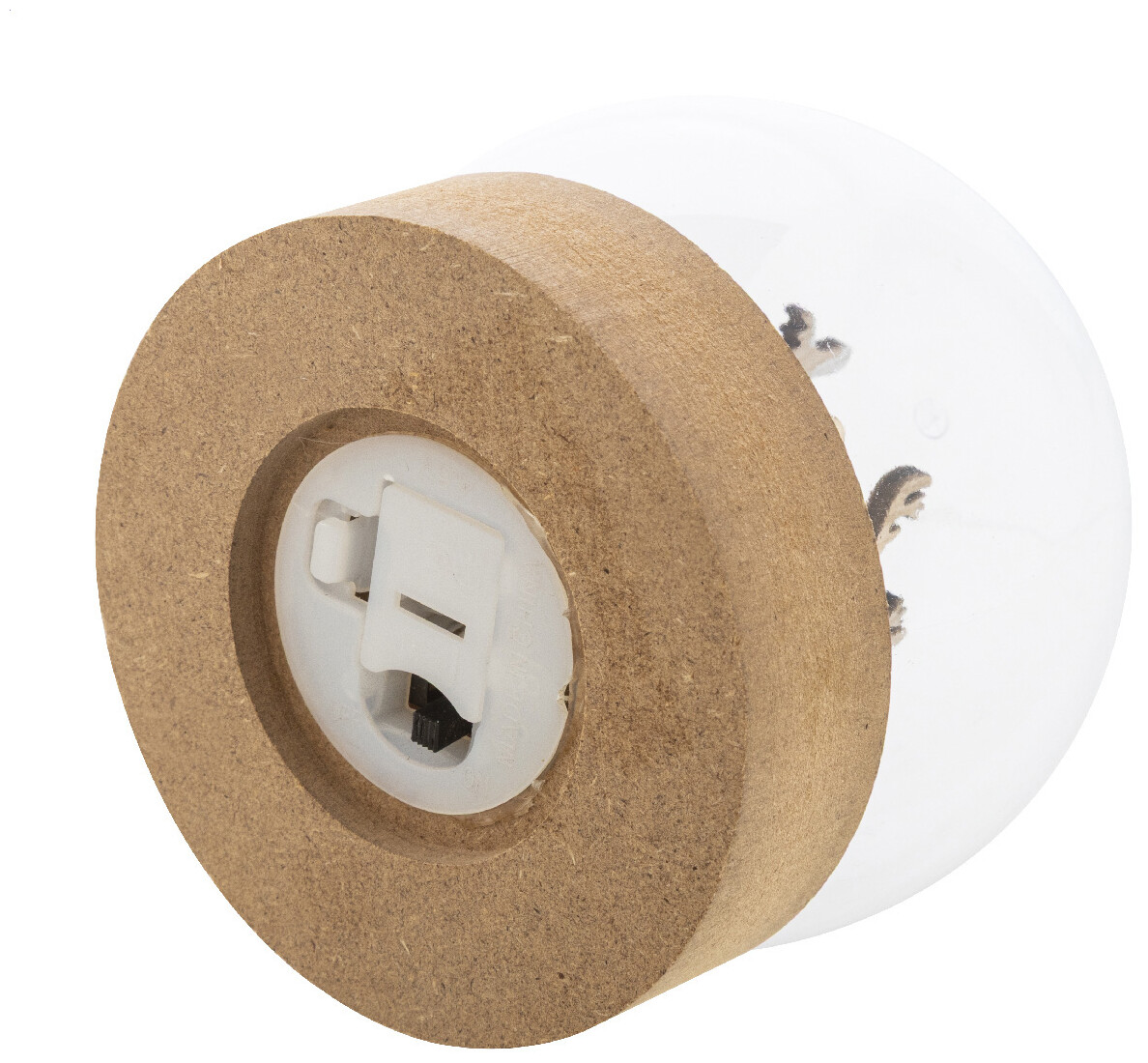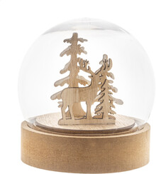 Vánoční dekorace ve tvaru sněhové koule, osvětlená, na dřevěném podstavci z MDF s LED světlem. Včetně knoflíkových baterií. S tlačítkem ZAP/VYP na podstavci.