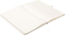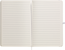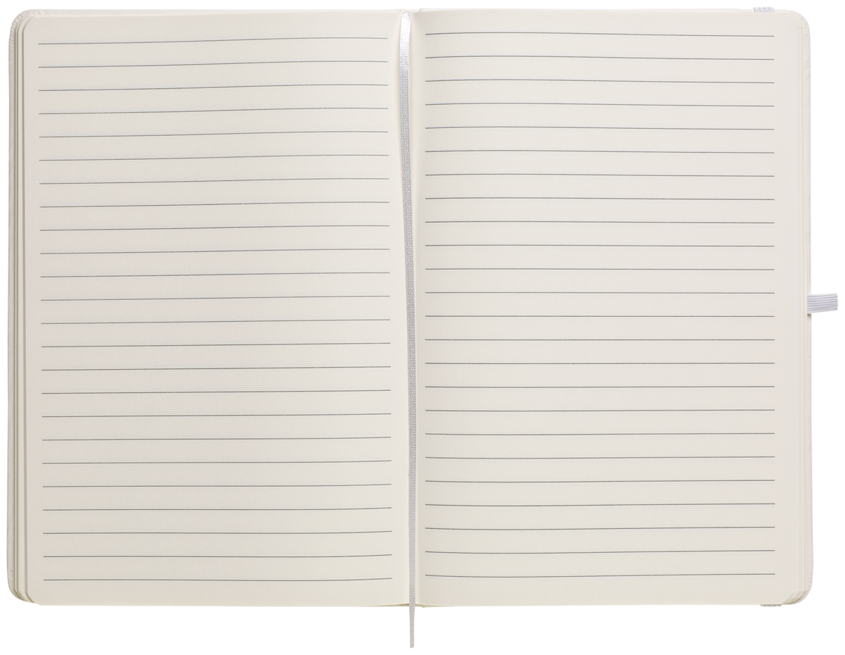 Zápisník A5 v bílých deskách z PU materiálu má 80 linkovaných listů. Blok má uzavírací gumičku, poutko na propisku a textilní záložku v barvě desek.