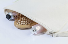Kosmetická taštička na zip ze 70 % recyklované bavlny a 30 % RPET polyesteru, 280 g/m2. S výraznou etiketou o recyklované bavlně.