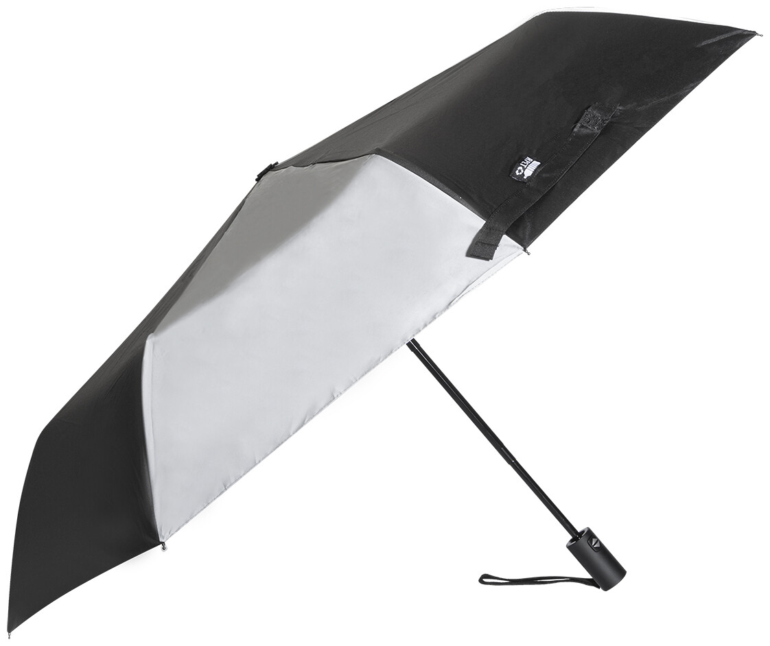 Velký, plně automatický (otevřít/zavřít) větruodolný skládací deštník se 4 panely z 190T RPET pongee a 4 panely z reflexní tkaniny. S kovovým rámem, žebry ze skelných vláken a pogumovanou rukojetí s poutkem na ruku. 190T RPET pongee. S charakteristickým štítkem RPET.