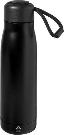 Dvoustěnná, vakuově izolovaná láhev z recyklované nerezové oceli s PP víčkem a integrovaným poutkem na nošení se šňůrkou. 500 ml.