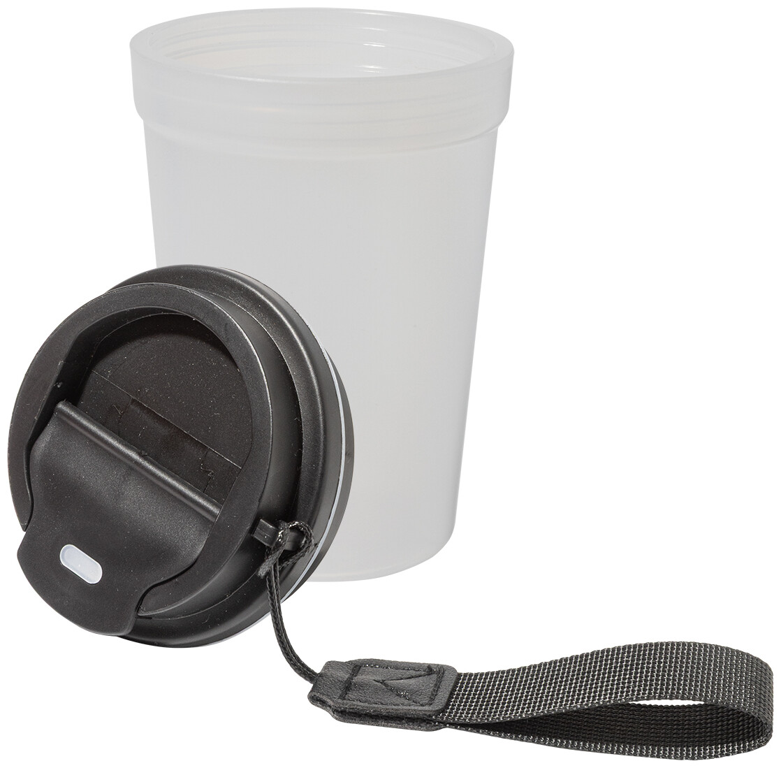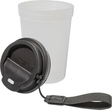 Jednostěnný cestovní kelímek z PP plastu s matnou povrchovou úpravou, víčkem na pití a poutkem z RPET polyesteru. 400 ml.
