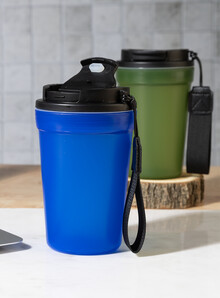Jednostěnný cestovní kelímek z PP plastu s matnou povrchovou úpravou, víčkem na pití a poutkem z RPET polyesteru. 400 ml.