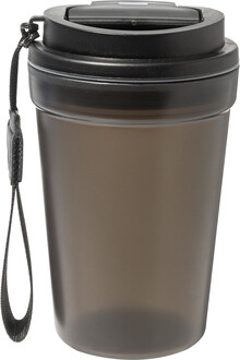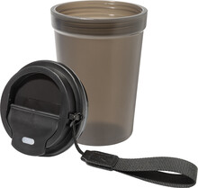 Jednostěnný cestovní kelímek z PP plastu s matnou povrchovou úpravou, víčkem na pití a poutkem z RPET polyesteru. 400 ml.