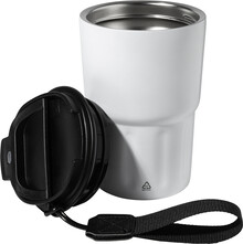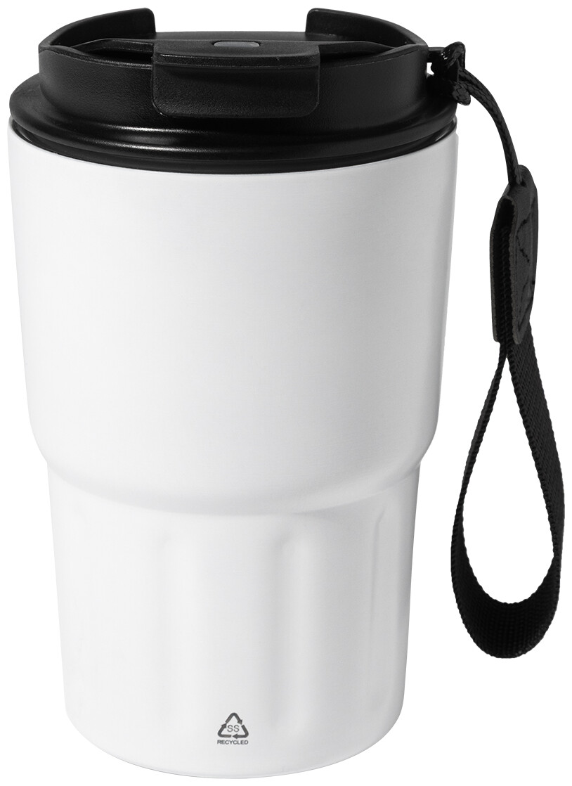 Dvoustěnný termo hrnek z recyklované nerezové oceli s izolačním víčkem z PP. S poutkem z RPET polyesteru. 350 ml.
