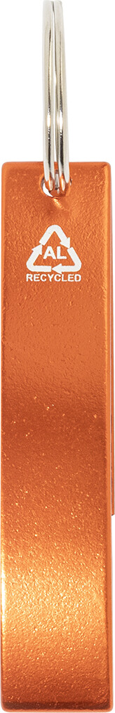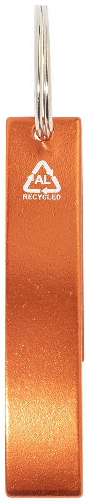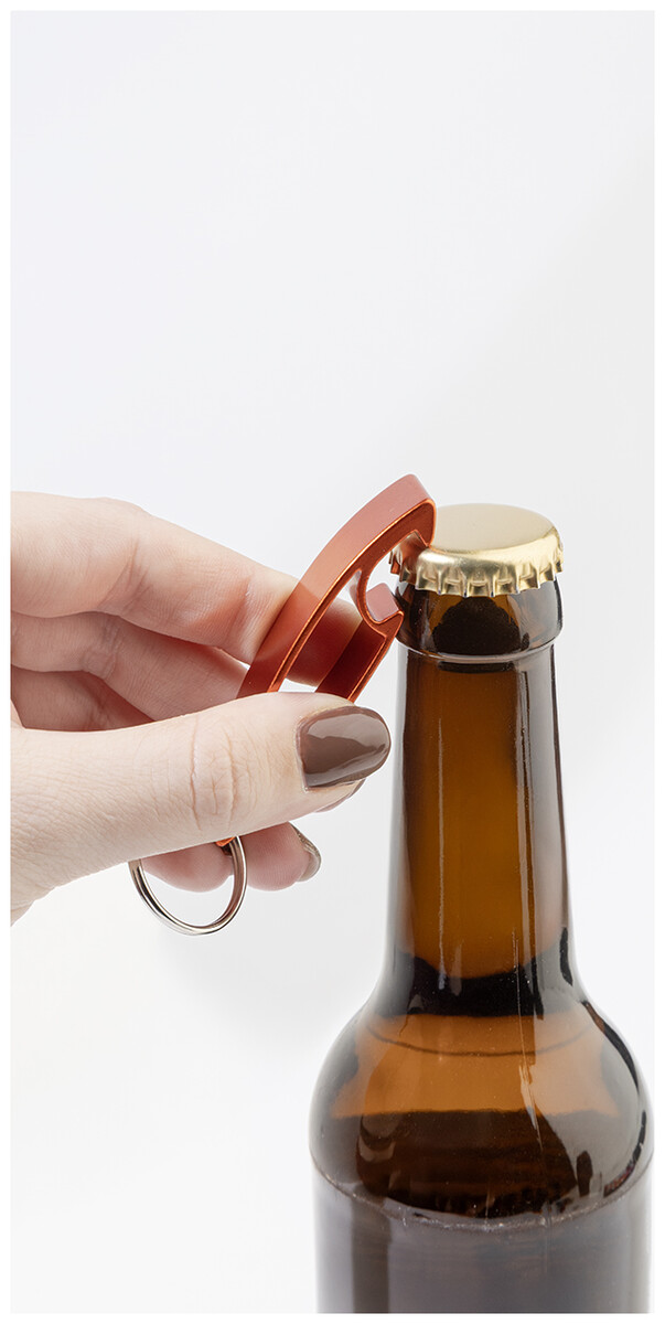 Otvírák na lahve z recyklovaného hliníku s kovovým kroužkem na klíče.