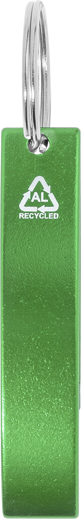 Otvírák na lahve z recyklovaného hliníku s kovovým kroužkem na klíče.