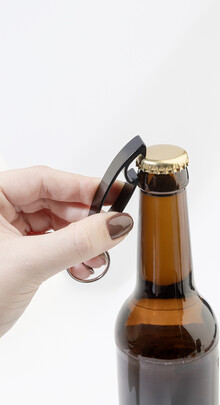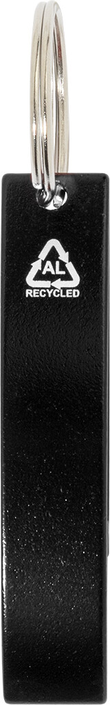 Otvírák na lahve z recyklovaného hliníku s kovovým kroužkem na klíče.