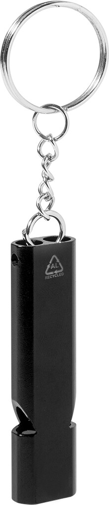 Píšťalka z recyklovaného hliníku s kovovým kroužkem na klíče.