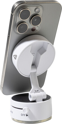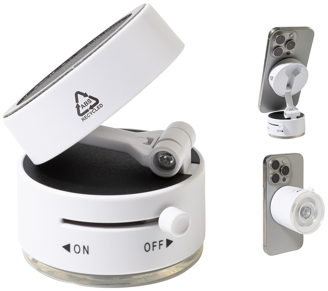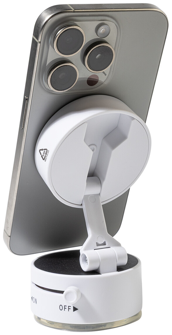 Magnetický držák na mobil do auta z recyklovaného ABS materiálu s přísavkou. Včetně samolepicího kovového kroužku pro telefony bez magnetického povrchu.