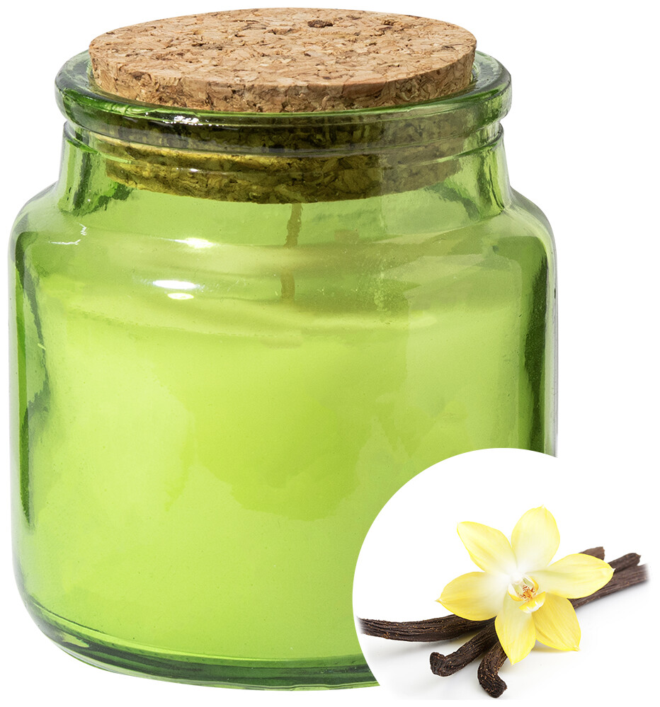 Vosková svíčka z rostlinného vosku s vůní vanilky ve skleněném svícnu s víčkem z přírodního korku. S 80 gramy vosku. Doba hoření: 16 hodin. V krabičce z kraftového papíru.