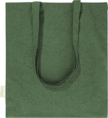 Nákupní taška s dlouhými uchy ze 70 % recyklované bavlny a 30 % RPET polyesteru, 140 g/m2. S výraznou etiketou o recyklované bavlně.