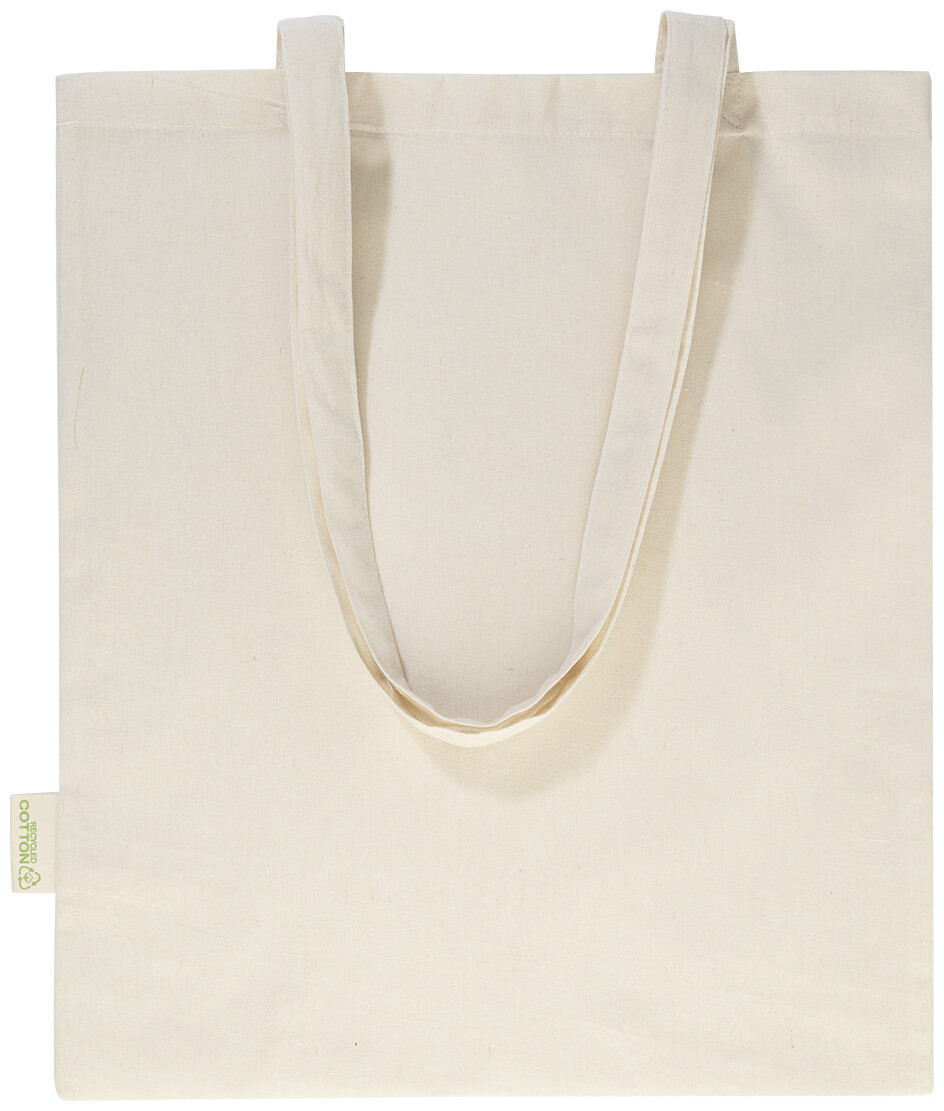 Nákupní taška s dlouhými uchy ze 70 % recyklované bavlny a 30 % RPET polyesteru, 140 g/m2. S výraznou etiketou orecyklované bavlně.