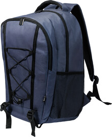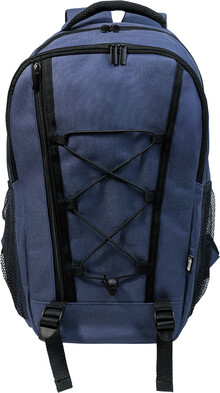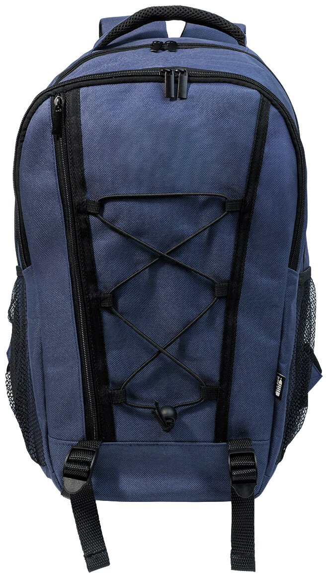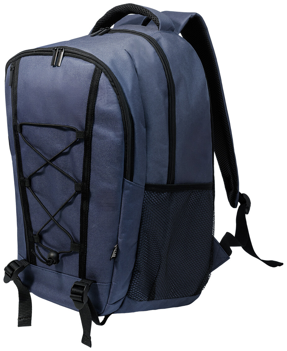 Outdoorový batoh z RPET s přihrádkami na zip a přední kapsou, polstrovanou přihrádkou na notebook (15"), síťovanými bočními kapsami a elastickými šňůrkami vpředu. S polstrovanými zády a ramenními popruhy. Polyester 600D RPET s výrazným štítkem RPET.