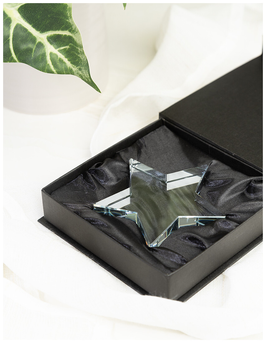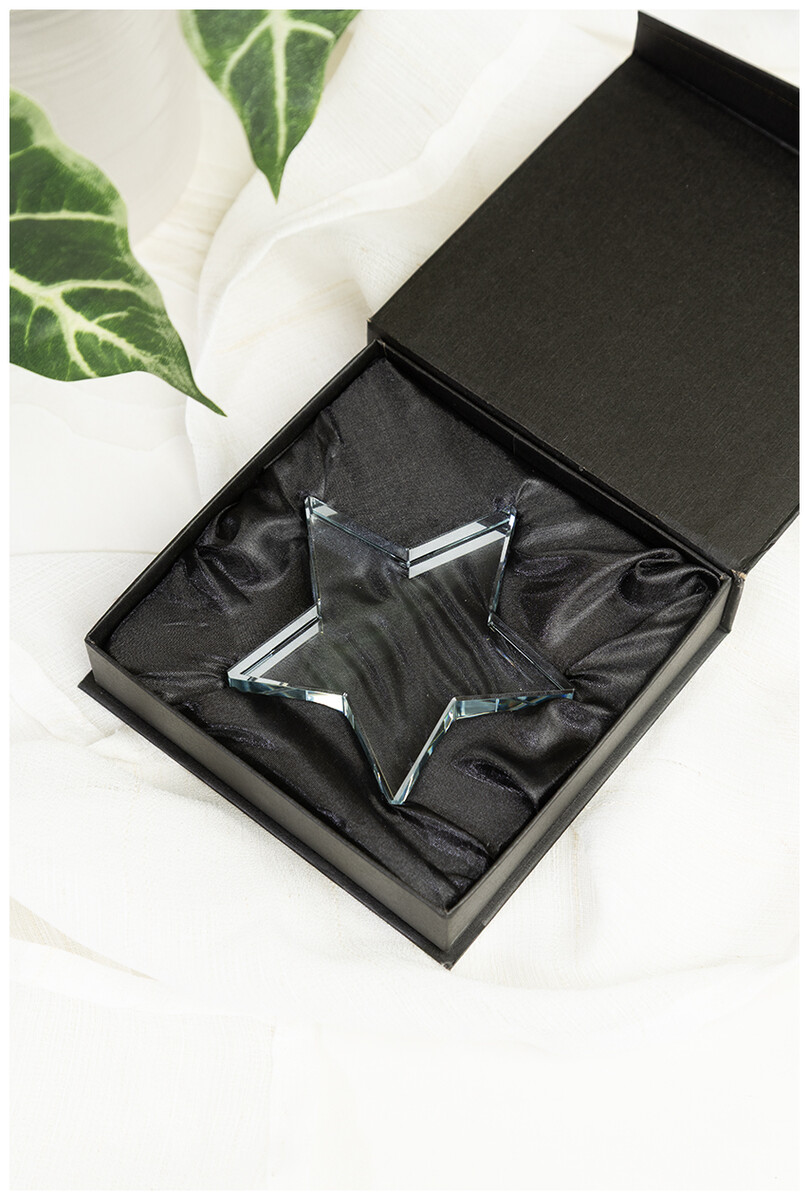 Skleněná trofej ve tvaru hvězdy v černé dárkové krabičce.