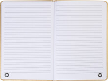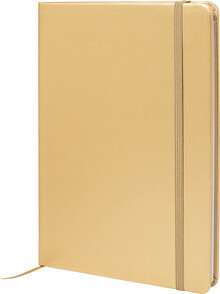Blok A5 s potahem z recyklované PU kůže s metalickou úpravou se 100 linkovanými listy z recyklovaného papíru. S barevnou záložkou a gumičkou.