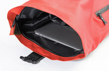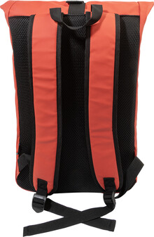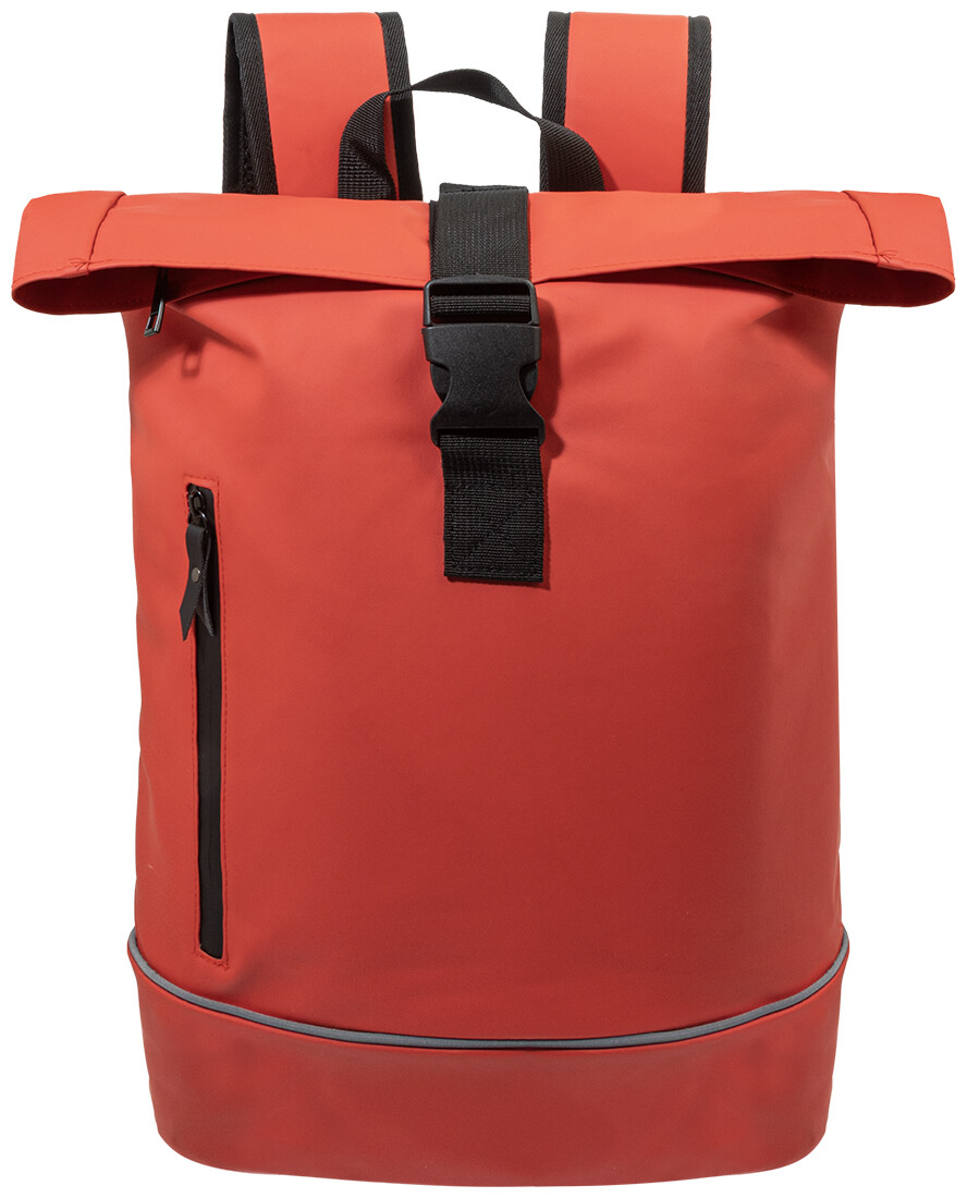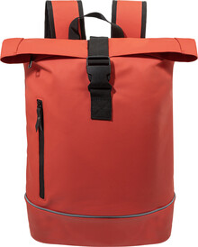 Voděodolný batoh s rolovacím vrškem z měkké recyklované PU kůže s hlavní přihrádkou na zip a zapínáním na přezku, přední kapsou s voděodolným zipem, polstrovanou přihrádkou na notebook (15") a reflexním proužkem. S polstrovanými zády a ramenními popruhy. S výraznou nálepkou z recyklované PU kůže. Pouze pro propagační účely, se produkt nekvalifikuje jako osobní ochranný prostředek.