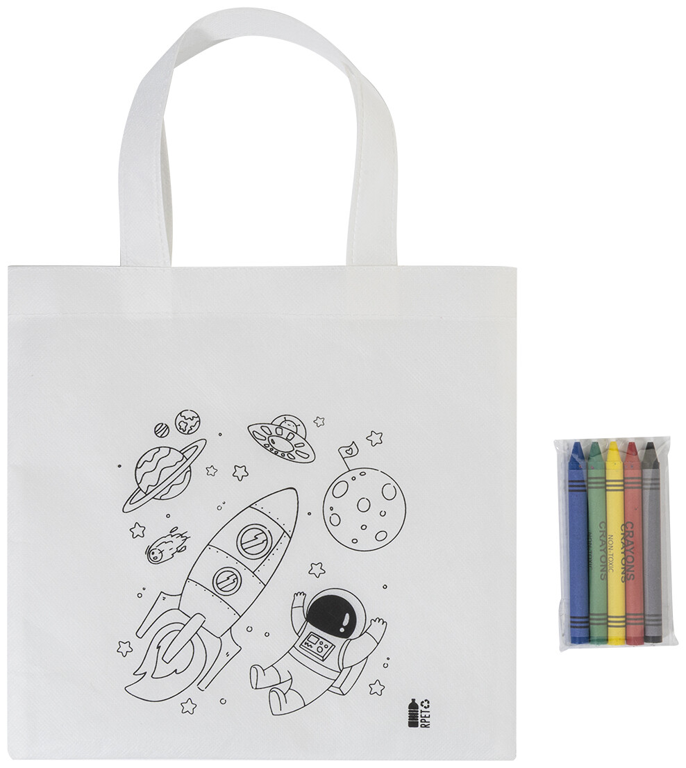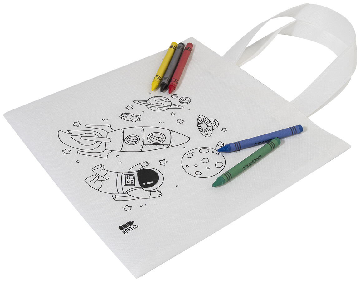 Mini nákupní taška z netkané RPET tkaniny s 5 voskovkami na vybarvení.
