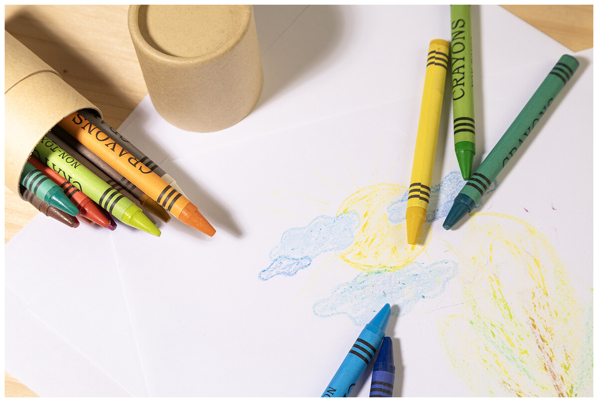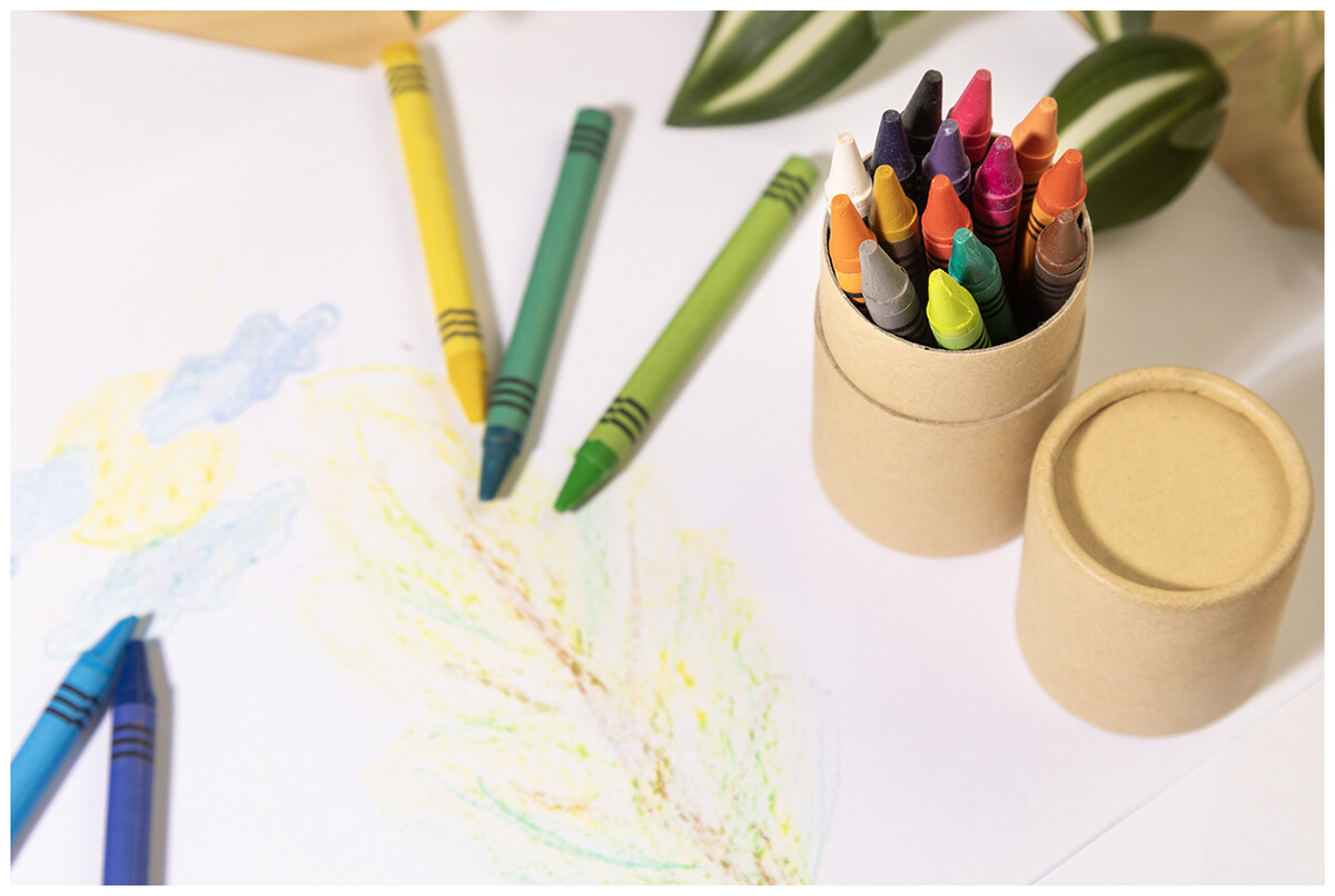 Sada 20 barevných voskovek v tubě z recyklovaného papíru.