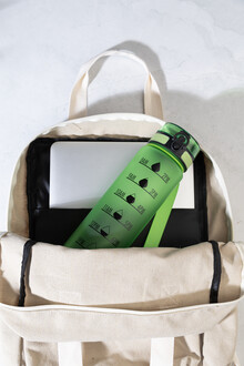Sportovní láhev z matného RPET s motivačním objemovým a časovým značením, s automaticky otevíratelným odklápěcím víčkem s bezpečnostním zámkem a poutkem na nošení. 1000 ml. Bez BPA. Nevhodné pro sycené nápoje.