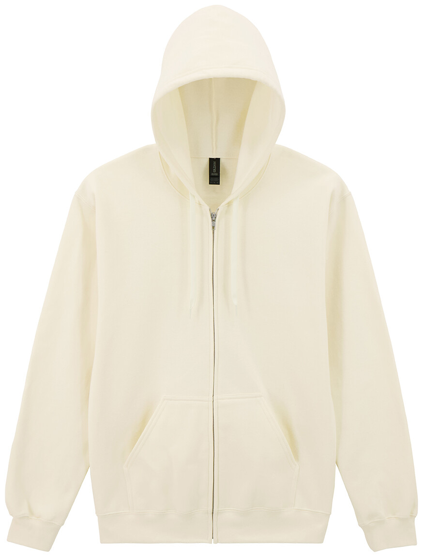 Mikina s kapucí na zip z 80% bavlny a 20% polyesteru s předními kapsami. 285 g/m2 (bílá 278 g/m2). Značka Gildan.