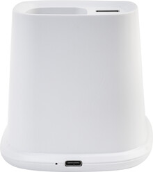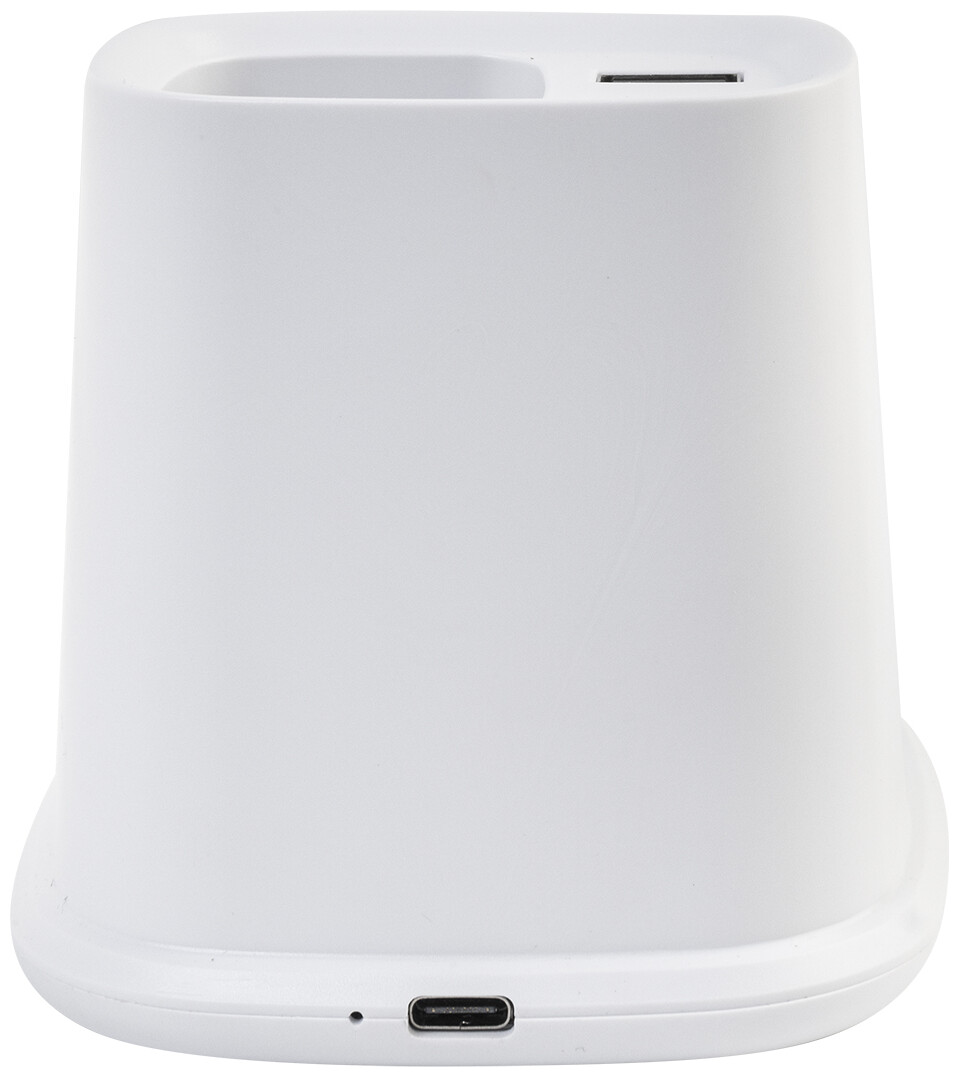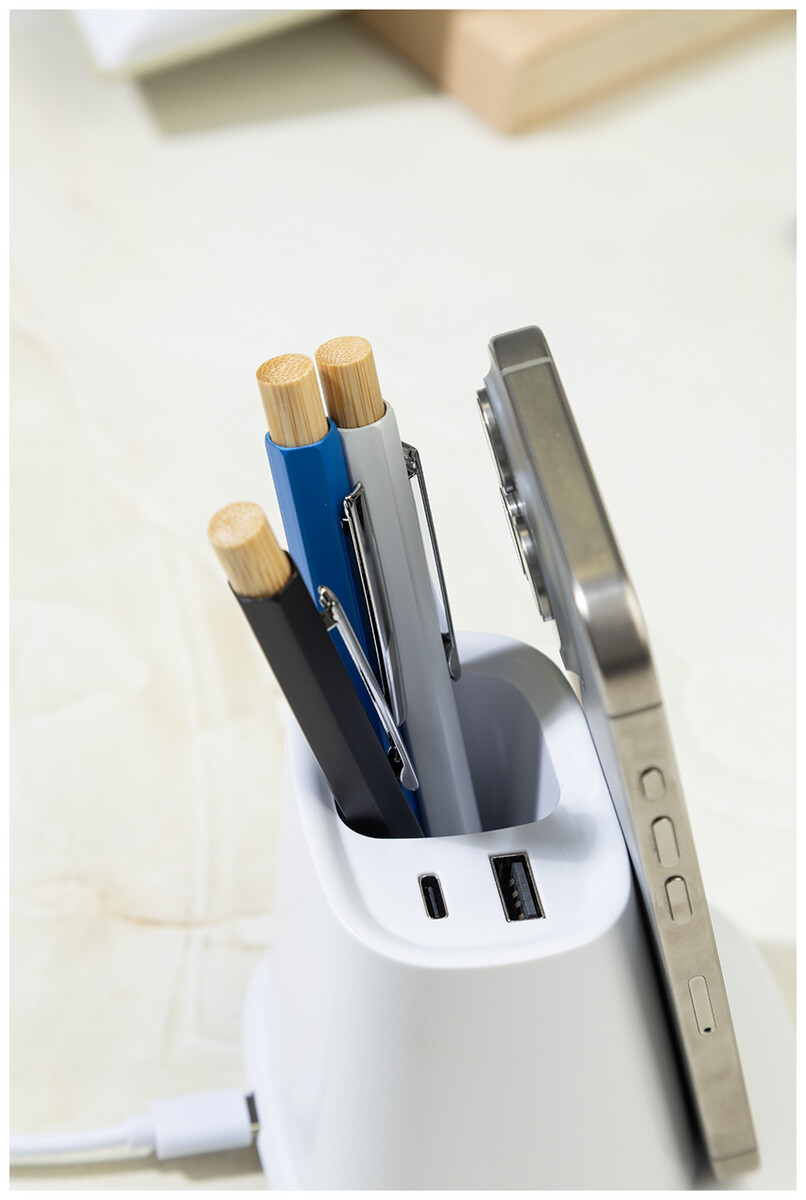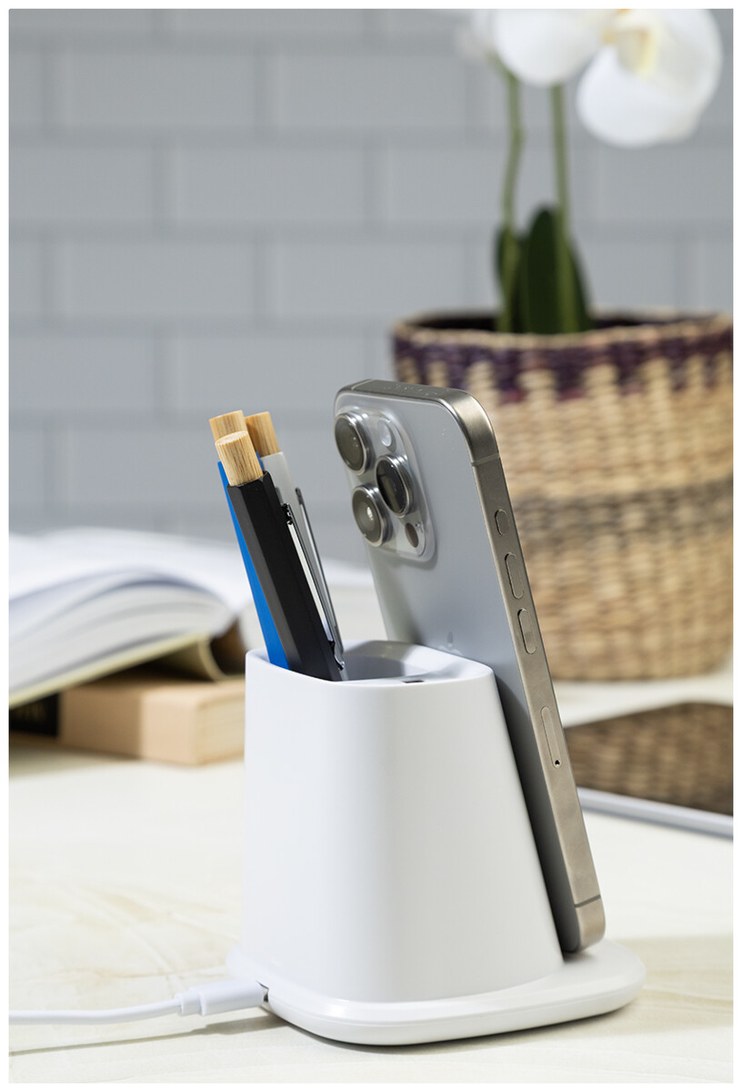 Multifunkční stojánek na pero z recyklovaného ABS plastu s držákem na mobil, vestavěnou bezdrátovou rychlonabíječkou (10 W), 1 USB a 1 USB-C portem pro nabíjení. Včetně USB kabelu pro nabíjení.