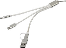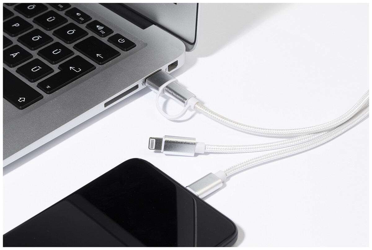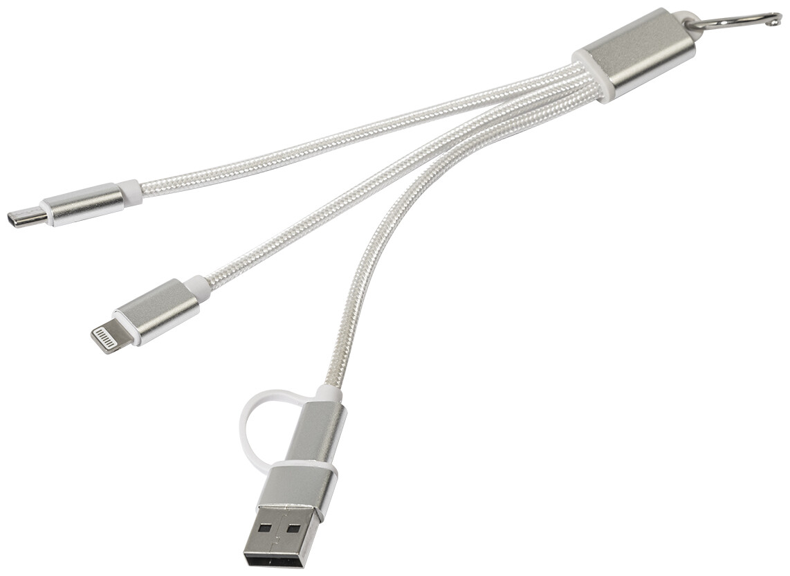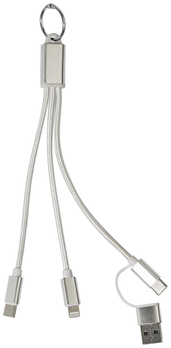 Nabíjecí kabel USB-C z recyklovaného hliníku a RPET s přívěskem na klíče. S konektory micro USB, USB-C a Lightning. S USB a USB-C vstupy.