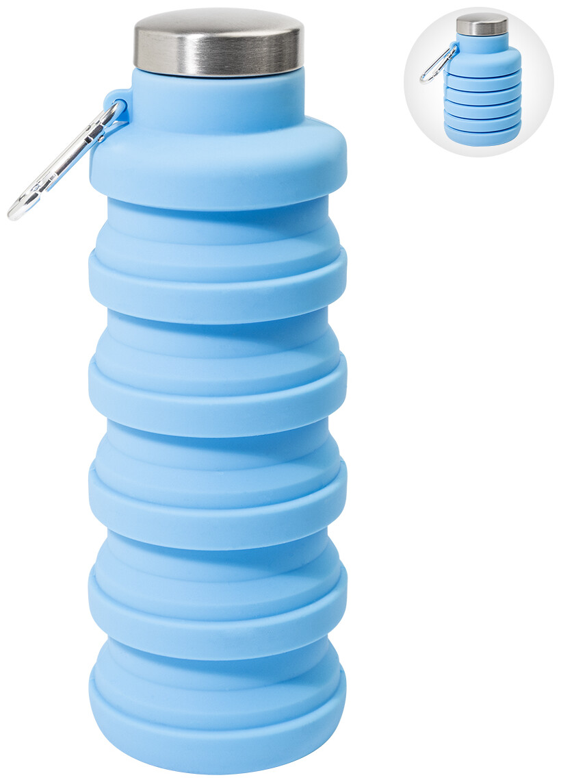 Skládací silikonová láhev s víčkem z nerezové oceli a hliníkovou karabinou. 500 ml