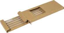 Sada 4 opakovaně použitelných brček na pití z borosilikátového skla s čisticím kartáčkem. V krabičce z kraftového papíru.