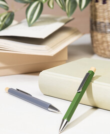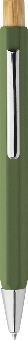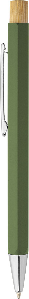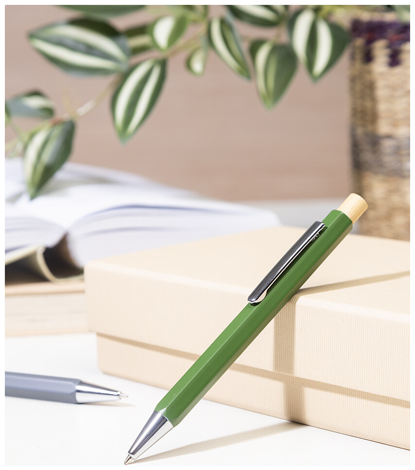 Šestihranné kuličkové pero z recyklovaného hliníku s bambusovým tlačítkem a chromovanými částmi. S modrou náplní.