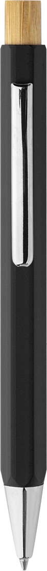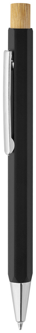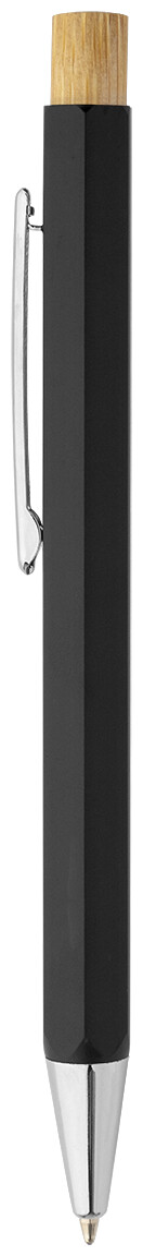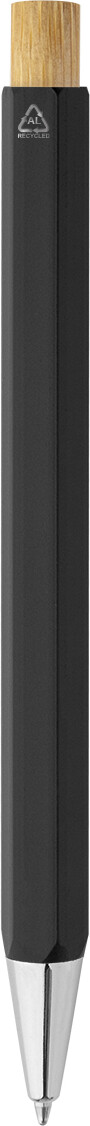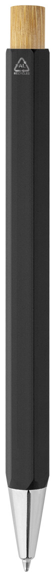 Šestihranné kuličkové pero z recyklovaného hliníku s bambusovým tlačítkem a chromovanými částmi. S modrou náplní.
