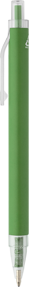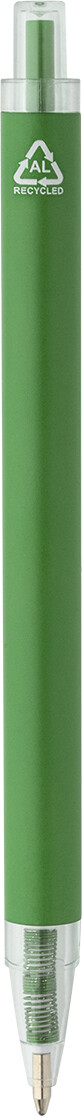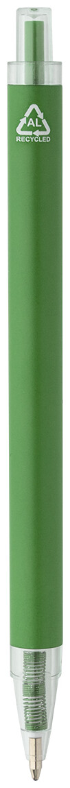 Kuličkové pero z recyklovaného hliníku s matným tělem a průhlednými RPET částmi. S modrou náplní.