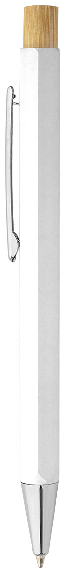 Šestihranné kuličkové pero z recyklovaného hliníku s bambusovým tlačítkem a chromovanými částmi. S modrou náplní.