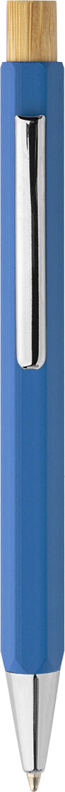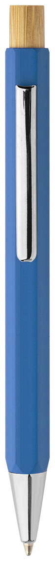 Šestihranné kuličkové pero z recyklovaného hliníku s bambusovým tlačítkem a chromovanými částmi. S modrou náplní.