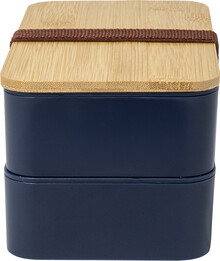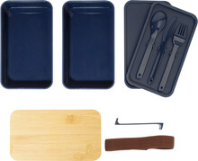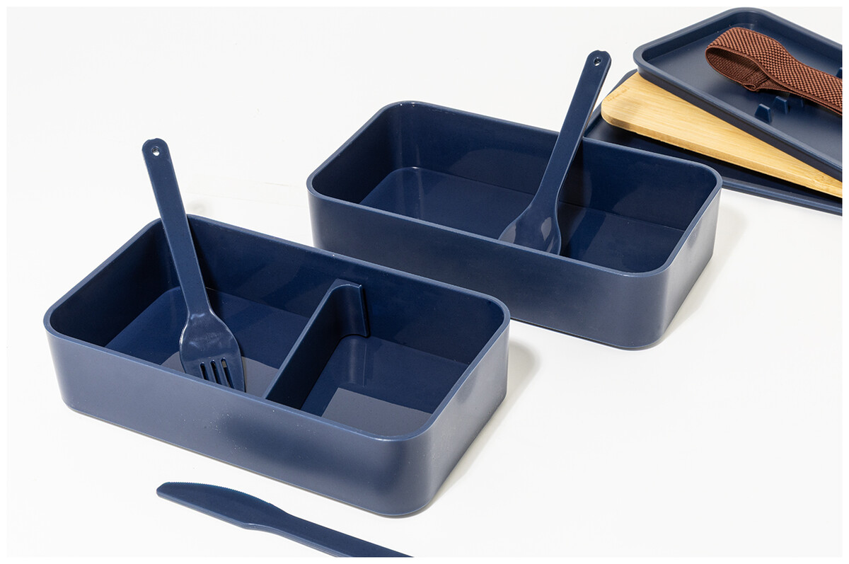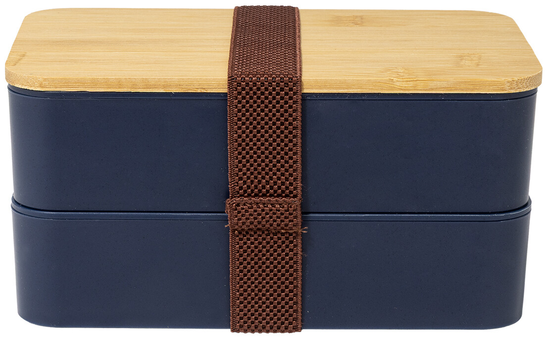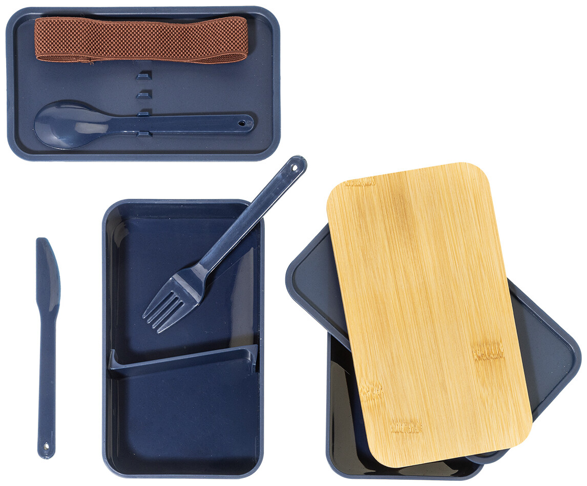 Box na jídlo z PP plastu se sadou příborů (vidlička, lžíce a nůž), bambusovým víkem a elastickým popruhem. Se 2 přihrádkami o objemu 700 ml.