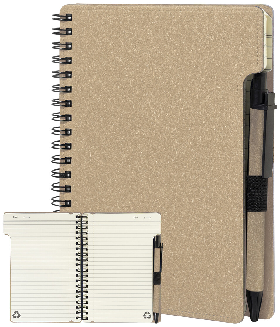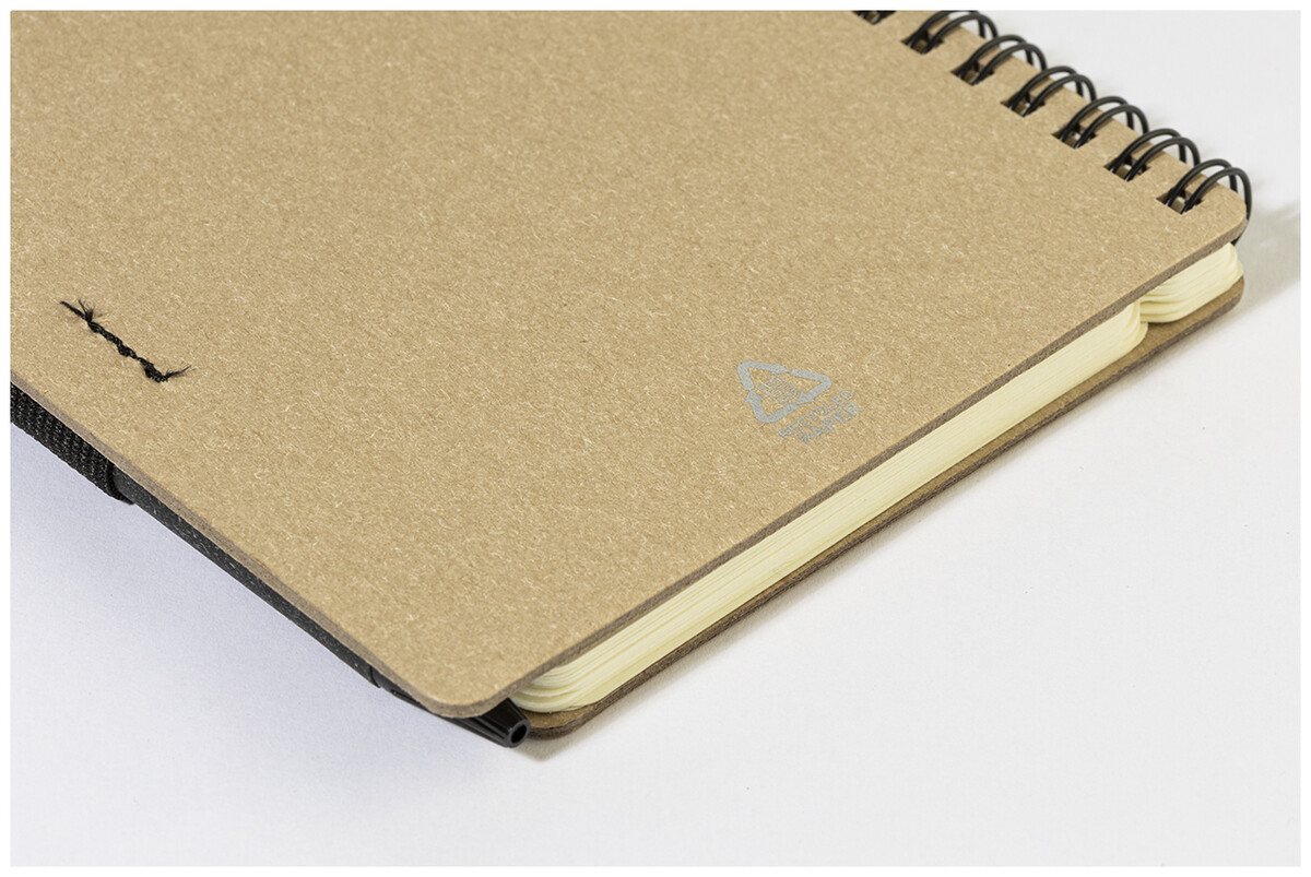 Spirálový blok A6 z recyklovaného papíru s 80 linkovanými listy. Včetně recyklovaného papíru a kuličkového pera z recyklovaného PP s modrou náplní.